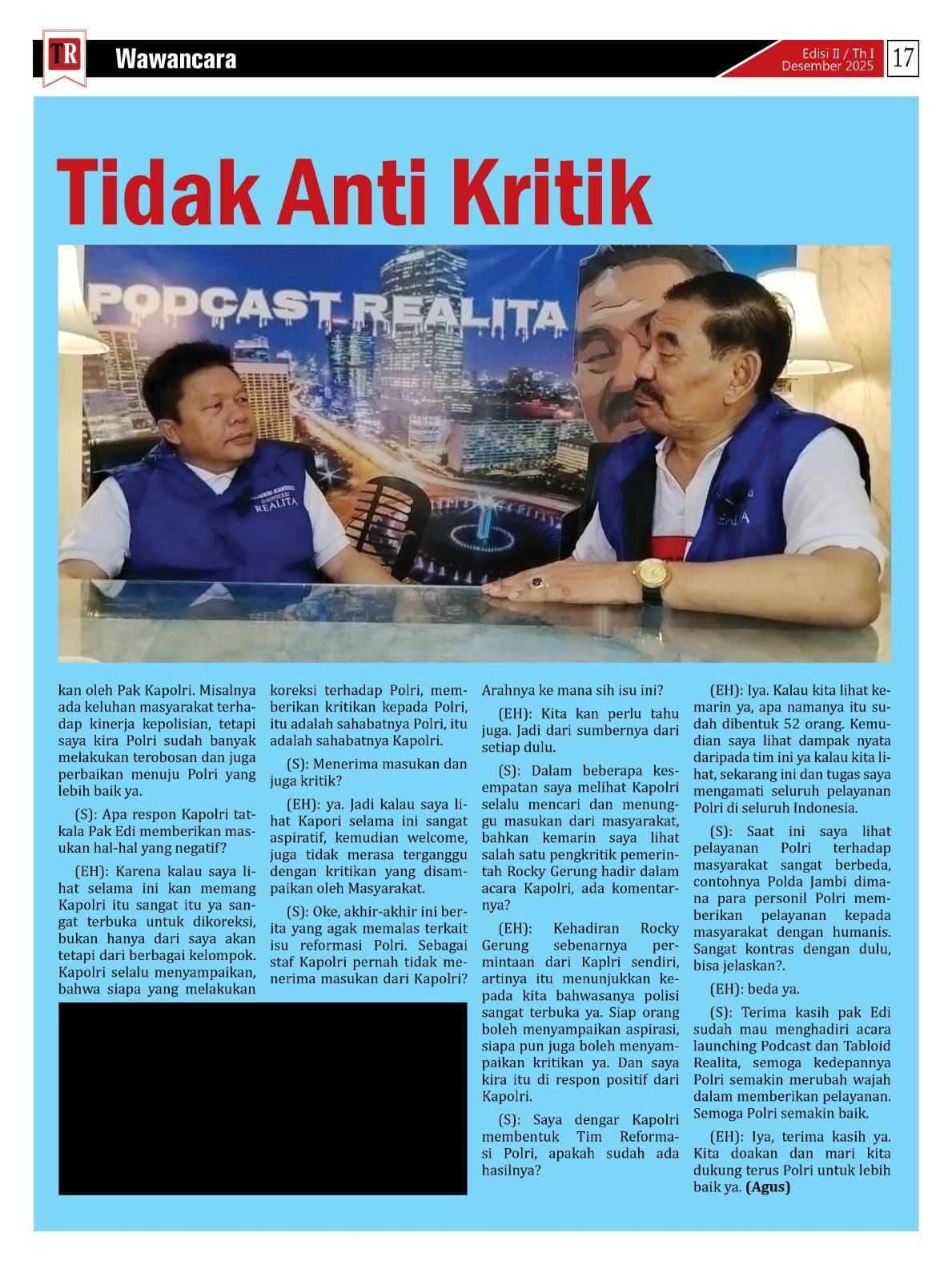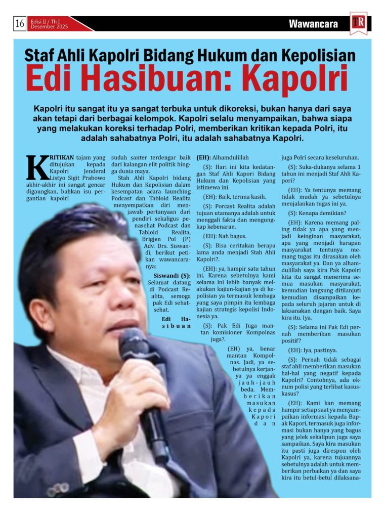 Wawancara Podcast Realita Edi Hasibuan: Kapolri Tidak Anti Kritik Redaksi Berita 29/11/2025 About the Author Redaksi Berita Subscriber View All Posts Post navigation Previous: Penguatan P4GN, Narkoba Bukan Sekedar Persoalan Hukum, Tapi KemanusiaanNext: Sehari, 50 Orang Meninggal Akibat Narkoba Leave a Reply Cancel replyYour email address will not be published. Required fields are marked *Comment * Name * Email * Website Save my name, email, and website in this browser for the next time I comment.